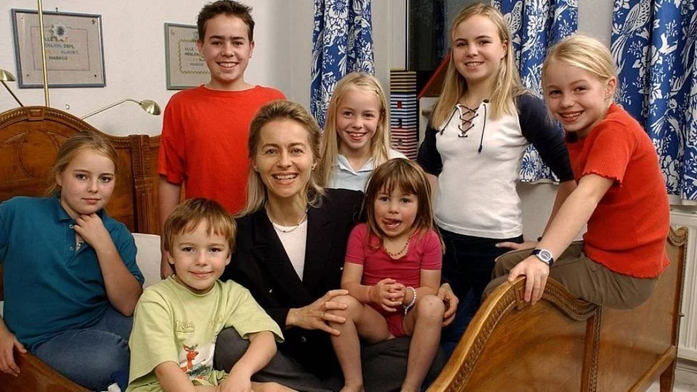 She was born and raised in Brussels to German parents. Her father, Ernst Albrecht, was one of the first European civil servants. She was brought up bilingually in German and French. She moved to Hanover in 1971, when her father entered politics to become Minister President of the state of Lower Saxony in 1976. As an economics student at the London School of Economics in the late 1970s, she lived under the name Rose Ladson, the family name of her American great-grandmother from Charleston, South Carolina. After graduating as a physician from the Hannover Medical School in 1987, she specialized in women's health. In 1986 she married fellow physician Heiko von der Leyen, of the von der Leyen family of silk merchants. As a mother of seven children, she was a housewife during parts of the 1990s and lived for four years in Stanford, California, while her husband was on the faculty at Stanford University, returning to Germany in 1996.